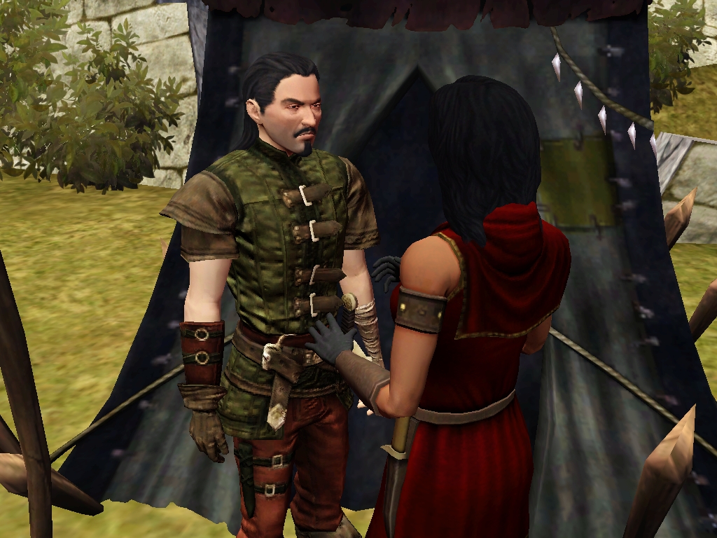 Amelia and Aramis emerge from the tent. Amelia hesitates, but she knows that she must see her plan through.